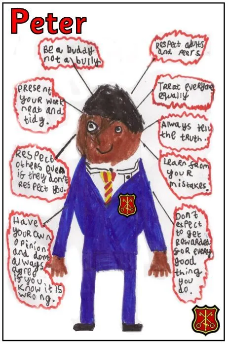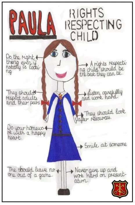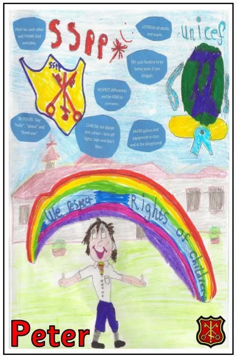 Our pupils were asked to create a model SS. Peter and Paul’s pupil (boy or girl) who would remind all pupils what being a rights respecting child at SSPP means. They were asked to consider how they would behave towards others in the classroom or the playground, how they should work with others, how they could take care of their environment and resources and show a rights respecting attitude at all times.