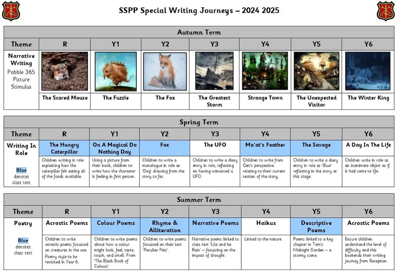Every term, children produce a piece of writing which forms part of their SSPP writing journey. This begins in Reception and travels with them through to the end of Year 6.