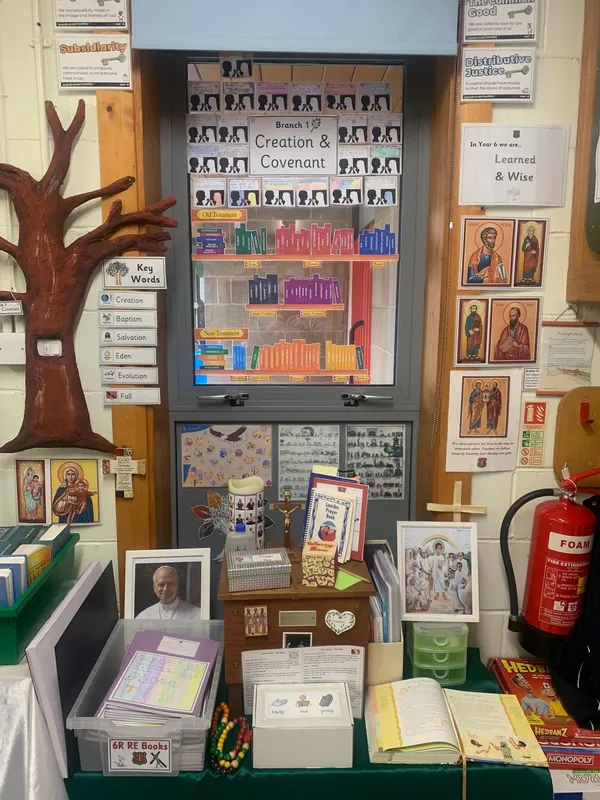 Each classroom has a dedicated prayer focus area. This are special places which reflect the current RE Branch being taught, as well as the colours of the relevant Liturgical season. Our prayer focus areas contain many artefacts which are special and allow for our RE books to be displayed in a place suitable for their importance.