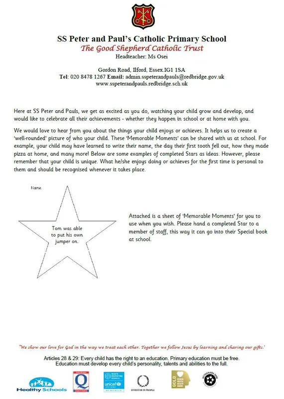 At SS Peter and Paul's we love to know about your child’s unique learning journey. Every time your child achieves a milestone fill out a ‘Memorable Moment Star’. An example of the sheets can be found on this page.