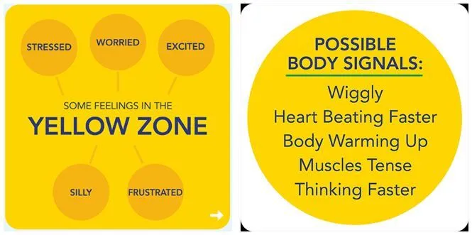 The YELLOW ZONE describes when our energy is higher, and our internal state starts to elevate. Our emotions get a little stronger. We may be experiencing stress, frustration, anxiety, excitement, silliness, confusion, nervousness, be overwhelmed, or have the wiggles, when in the Yellow Zone.