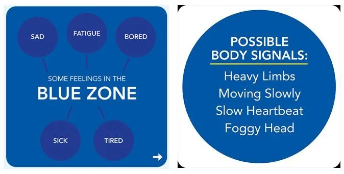 The BLUE ZONE describes low states of alertness and down feelings, such as when a person feels sad, tired, sick, hurt, lonely, or bored. Our energy is low and our body is moving slowly when we are in the Blue Zone.