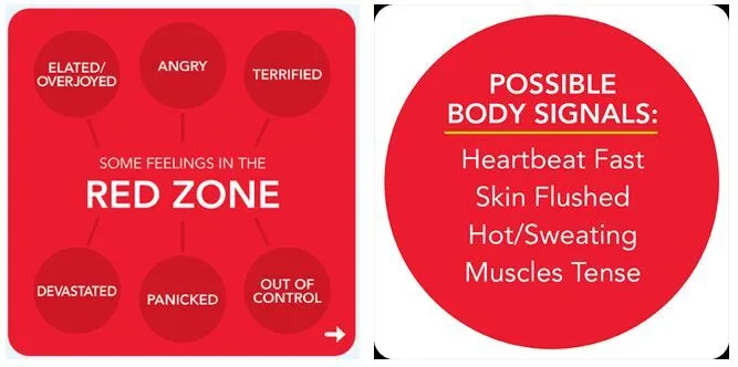 The RED ZONE describes a state of extremely high energy and intense, very overwhelming feelings. We may be in an extremely heightened state of alertness, potentially triggering our fight, flight, freeze or flee protective response. We may feel elated, euphoric, anger, rage, devastated, out of control, panicked, or terrified when in the Red Zone.