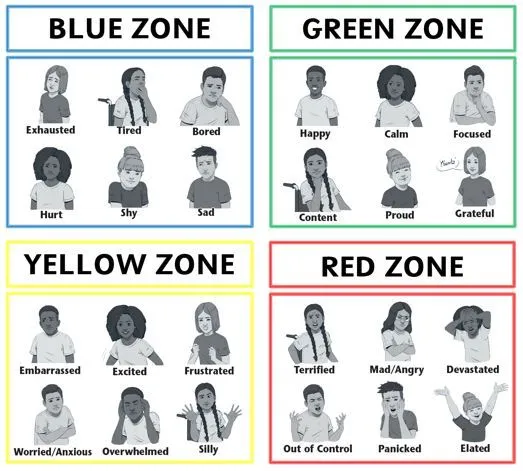 Feelings are complicated. They come in different sizes, intensities, and levels of energy that are unique within our brains and bodies. To make them easier to talk about, think about, and regulate, The Zones of Regulation organises our feelings, states of alertness, and energy levels into four coloured Zones – Blue, Green, Yellow, and Red. The simple, common language and visual structure of The Zones of Regulation helps make the complex skill of regulation more concrete for learners and those who support them. We learn to regulate our Zones to meet our goals and task demands, as well as support our overall well-being.